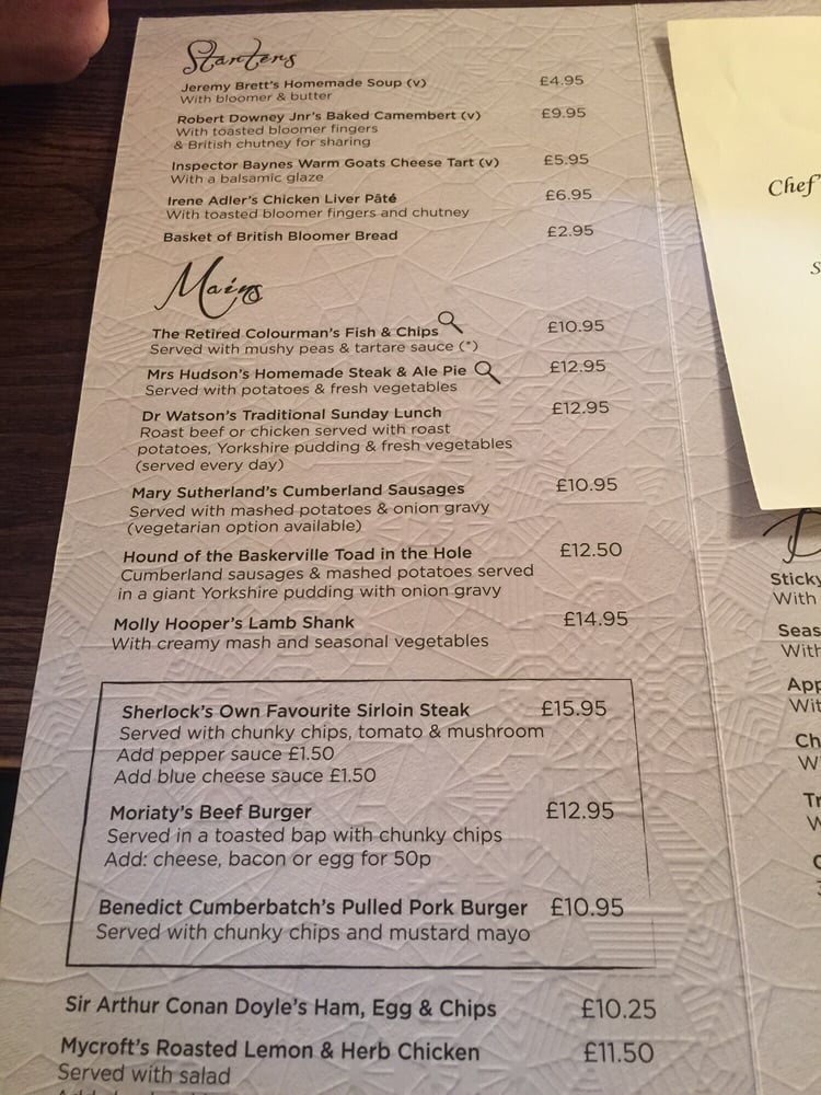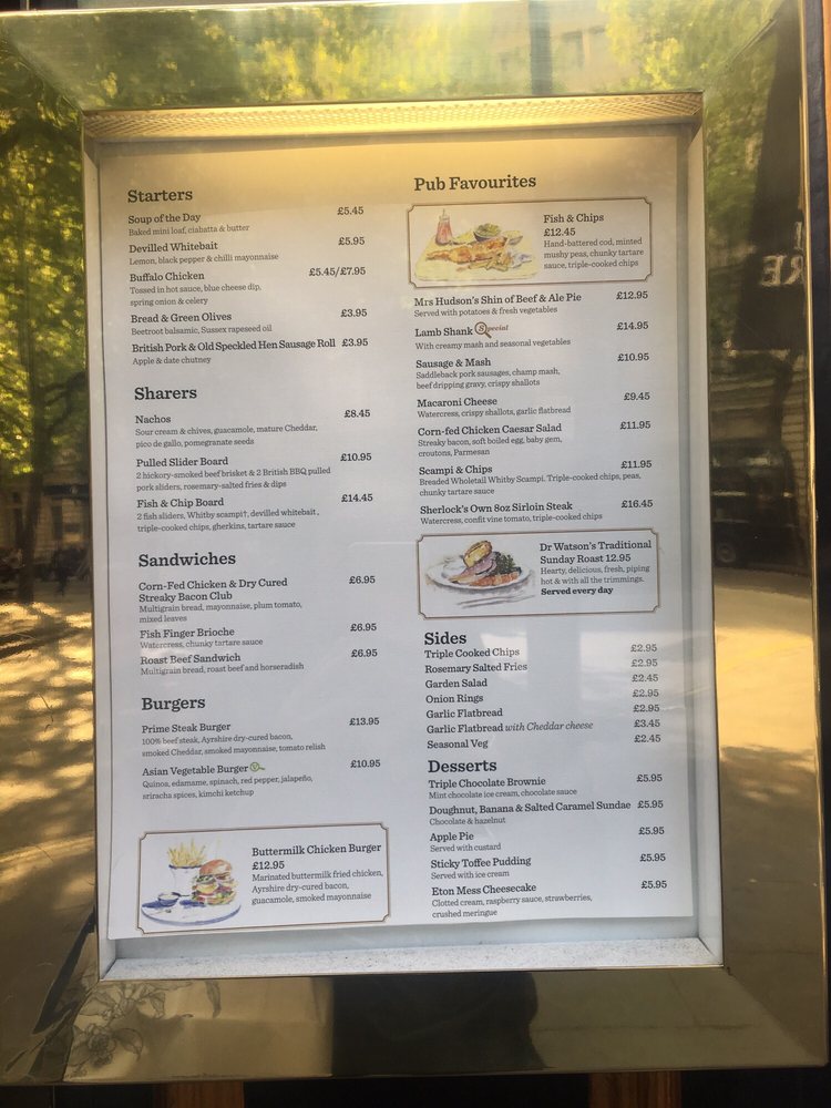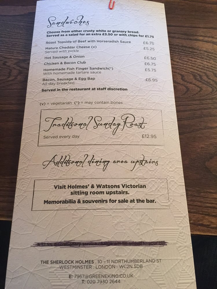 Sherlock Holmes is a charming pub located at 10-11 Northumberland Street in London, offering a casual and tourist-friendly atmosphere. The menu features a variety of pub classics and hearty dishes perfect for a satisfying meal. You can enjoy outdoor seating, free Wi-Fi, and a full bar with options for everyone. The venue is perfect for groups and offers activities like pool tables and dancing. With its prime location and cozy ambiance, Sherlock Holmes is a great spot to unwind and enjoy a night out. Make sure to visit on Wednesday or Thursday for the best experience. Overall, Sherlock Holmes provides a fun and inviting dining experience for locals and visitors alike.