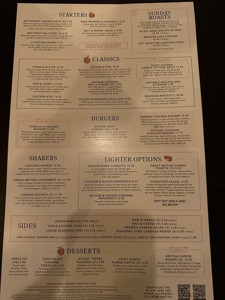 Our Sunday roasts are served with crisp, fluffy roast potatoes, Yorkshire pudding, charred Hispi cabbage wedge, roasted carrots, cauliflower cheese and a rich gravy V